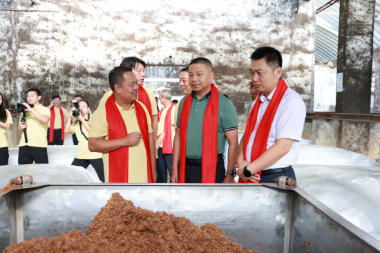 金秋開窖,佳釀天成。與會領(lǐng)導(dǎo)及特邀經(jīng)銷商代表、消費者代表移步窖池區(qū),秦玉龍、曾洋共同揭開紅綢,開啟稻花香2025年秋釀的第一口窖池。經(jīng)驗豐富的釀酒師傅上前,嫻熟地鏟去窖池封泥,開始分層起糟,整套動作一氣呵成。一股股混合著窖香、糟香、酯香的氣息撲面而來,令觀者無不沉醉其中。